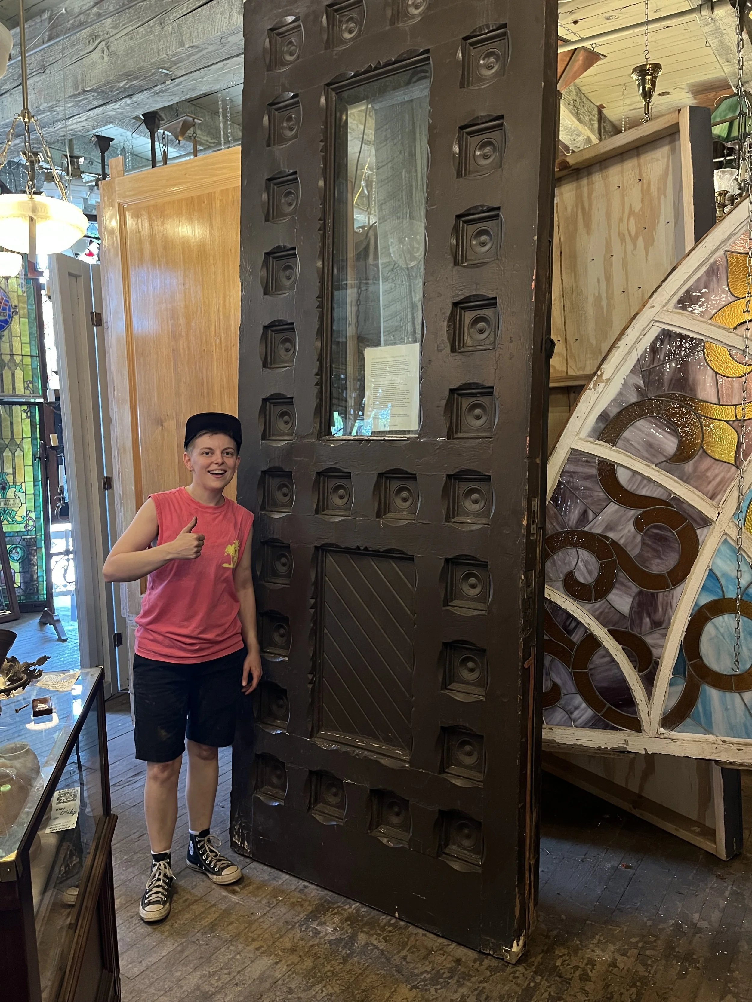 Architectural salvage, including doors, windows, mantels, cabinetry, and metalwork